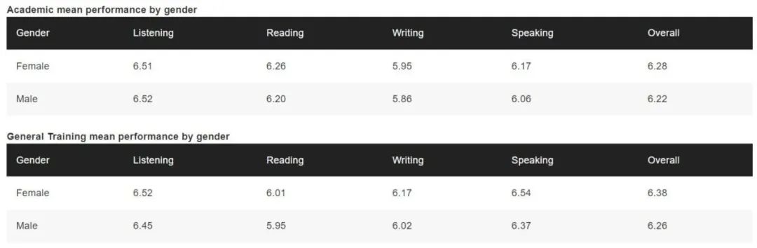 从考试均分表现来看,女性考生整体分数略高于男性,在2022年A类雅思考试中,女性考生的总分均分比男性考生高0.06分;G类雅思考试中女性考生总分均分比男性考生总分均分高出0.12分。