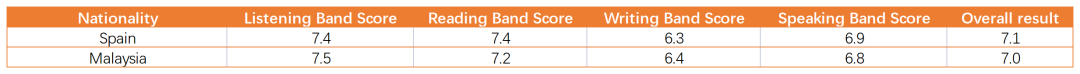 在39个被统计的国家中,只有2个国家的考生在A类考试总分均分达到7.0水平,分别为西班牙(7.1)和马来西亚(7.0)。