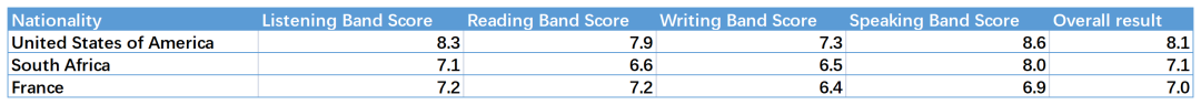 G类雅思整体表现优于A类,高分段的国家也更多,在美国地区参加G类雅思考试的考试总分均分达到了8.1分,排名第二名、第三名的国家为南非共和国(7.1)和法国7.0。