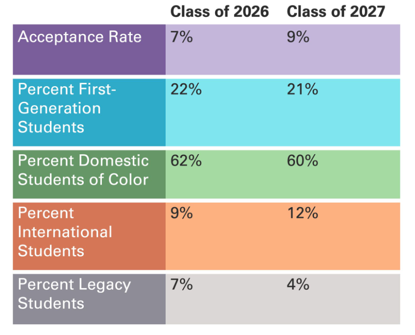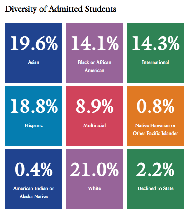 录取的学生里有64%认为自己是非裔美国人、亚裔美国人、拉丁裔或西班牙裔、美洲原住民或多种族。23%的人是家庭中第一代上四年制大学的人,11%是国际生。