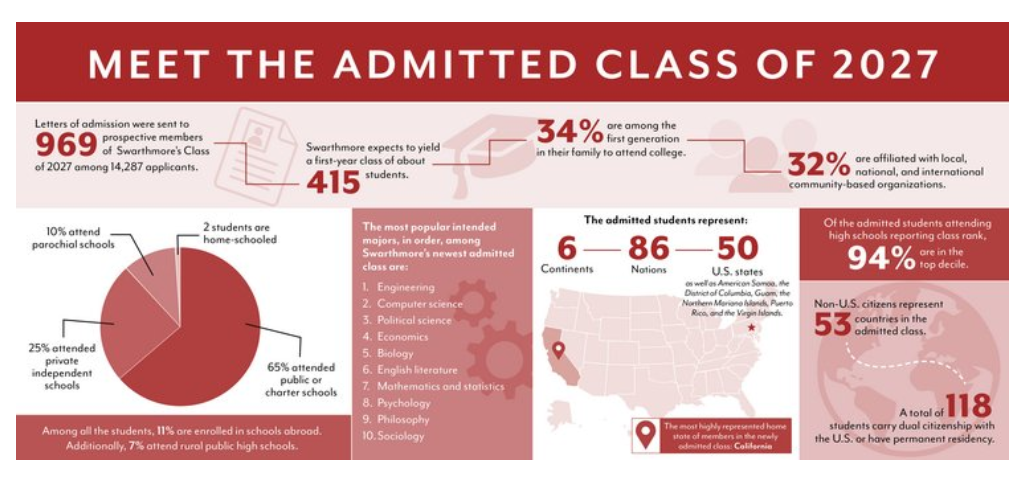 斯沃斯莫尔学院2027届一共有14287人申请,有969名申请者收到了录取通知书。录取的学生中有34%是第一代大学生。65%的学生就读于公立学校,25%就读于私立学校,10%就读于教区学校,还有两名学生是家庭教育。