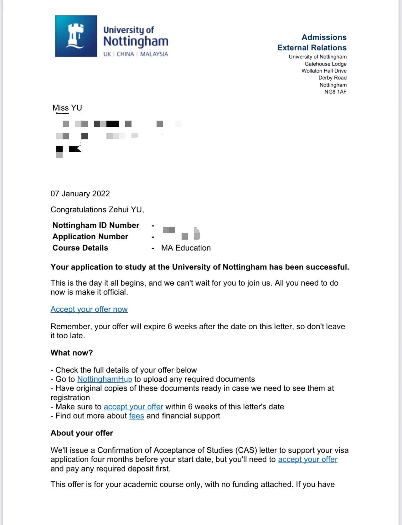 余泽晖,人文学院18级学前教育专业本科四班,收获offer:诺丁汉大学(103)、约克大学(151)、卡迪夫大学(151)、莱斯特大学(236)四所大学教育学研究生offer。