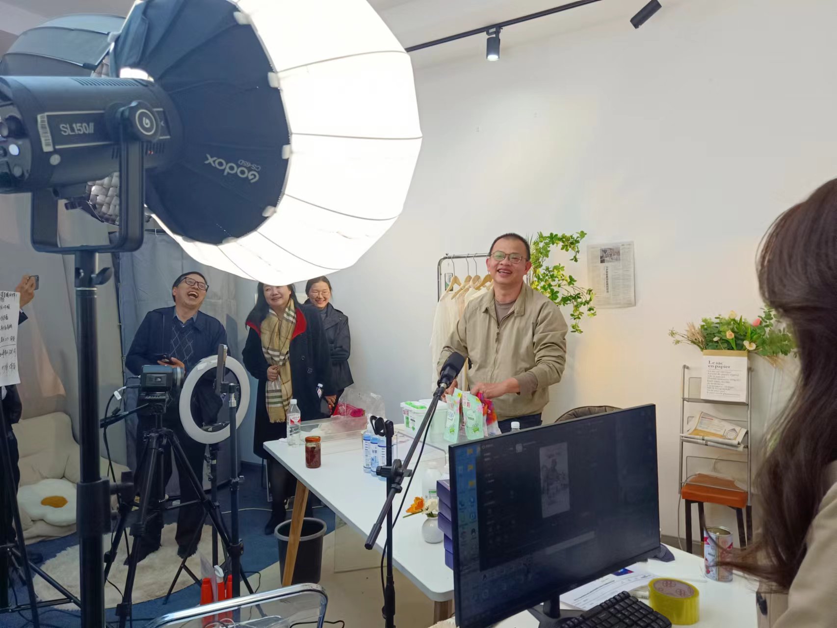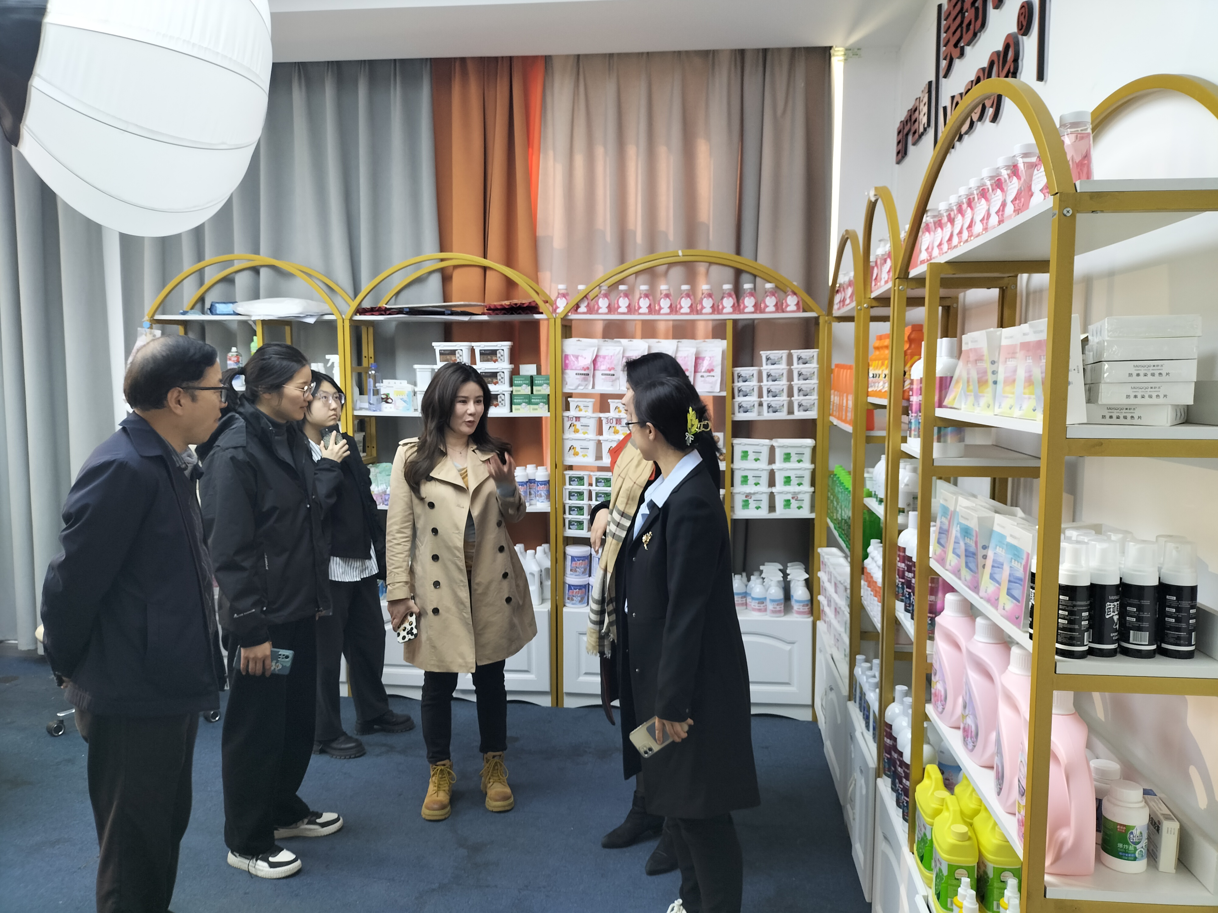 兄弟院校一行首先来到武汉超好生物科技有限公司,卢总热情接待。卢总带领老师们参观了公司的产品和直播间,各位领导也化身主播,体验了一把直播带货。参观过后,双方在会议室召开了座谈会,就电子商务行业的发展态势、电商直播人才的培养以及电商直播的技巧等进行了热烈的交流。