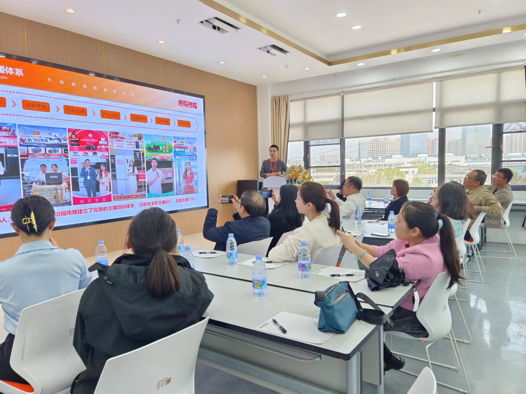 参观完武汉超好生物科技有限公司之后,便来到企业参观的第二站:武汉启视传媒科技有限公司,该公司运营部总监张海涛热情接待。首先,张总带领老师们参观了公司占地5000余平方的直播基地,重点参观了一线家电品牌华帝公司的直播现场,双方也在参观过程中就直播技巧、直播方式方法等展开了热烈的交流和讨论。 随后,双方在启视传媒报告厅举行了交流会,张海涛总监介绍了公司的基本业务、市场地位和发展情况,同时还简单讲解了:该企业从0到10亿营业额的发展历程,随后与老师们表达了对直播人才的需求及合作培养直播人才的期待,老师们也从产教融合以及电商人才的培养等方面与张总展开了交流。