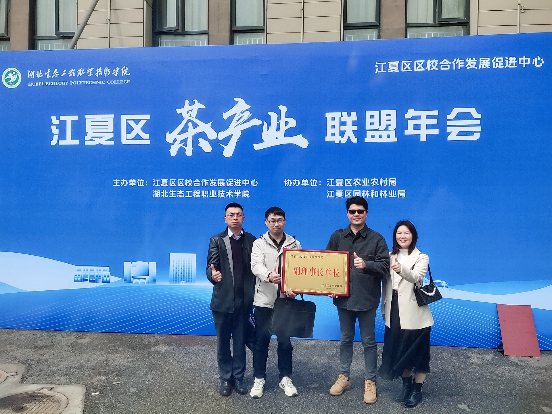 3月28日,由江夏区区校合作发展促进中心主办的江夏区茶产业联盟年会,在湖北生态工程职业技术学院隆重举行,相关高校专家学者、茶企代表出席了本次年会。武汉工程科技学院经济与管理学院副院长毛洪涛教授携教师石忠义、刘芳和乡村振兴学院教师易葳,代表学校参加此次会议。