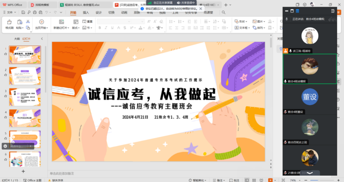 专科毕业班辅导员开展“诚信考试,从我做起”主题班会,向全体考生开展普法教育和警示教育,强调诚信守法考试相关要求。