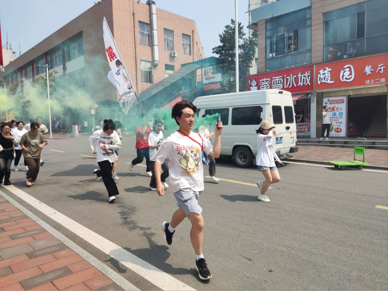 活动第六项,学生准备起跑,领导老师于签字板签字并进行合影留念。李乐宜老师与甘小瑞同学台下准备领跑,挥舞旗子后参赛人员开跑。