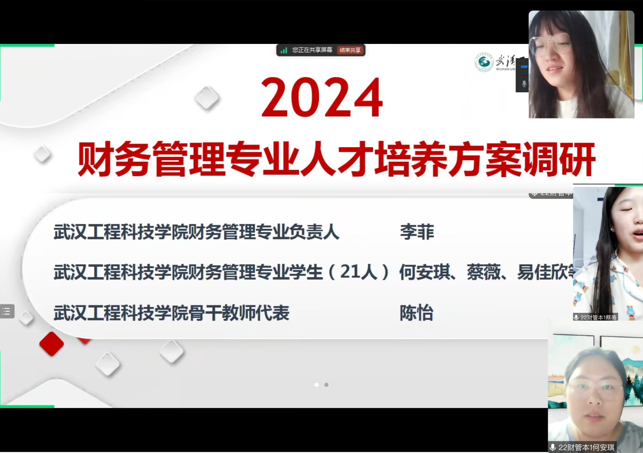 2024年6月7日晚上19:00,李菲教授邀请财务管理专业在校学生(学生参会人数21人)通过线上视频会议进行调研交流,就新一轮人才培养方案的设计思路以及课程体系框架进行了沟通,针对2024财务管理专业人才培养方案课程设置、各教学环节的设计等征求学生意见与建议。