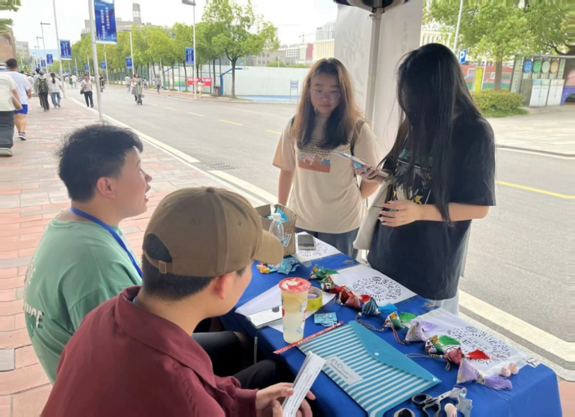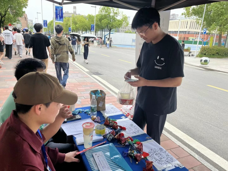 摆点现场热闹非凡,吸引了众多同学前来参与。为了增加活动的趣味性和知识性,现场还设置了端午知识问答环节,同学们积极参与,不仅学到了知识,还获得了精美的小礼品,完成答题的同学可以获得一个小香囊加一个随机惊喜小礼物。没有完成答题的同学也可以领到一个惊喜小礼物。