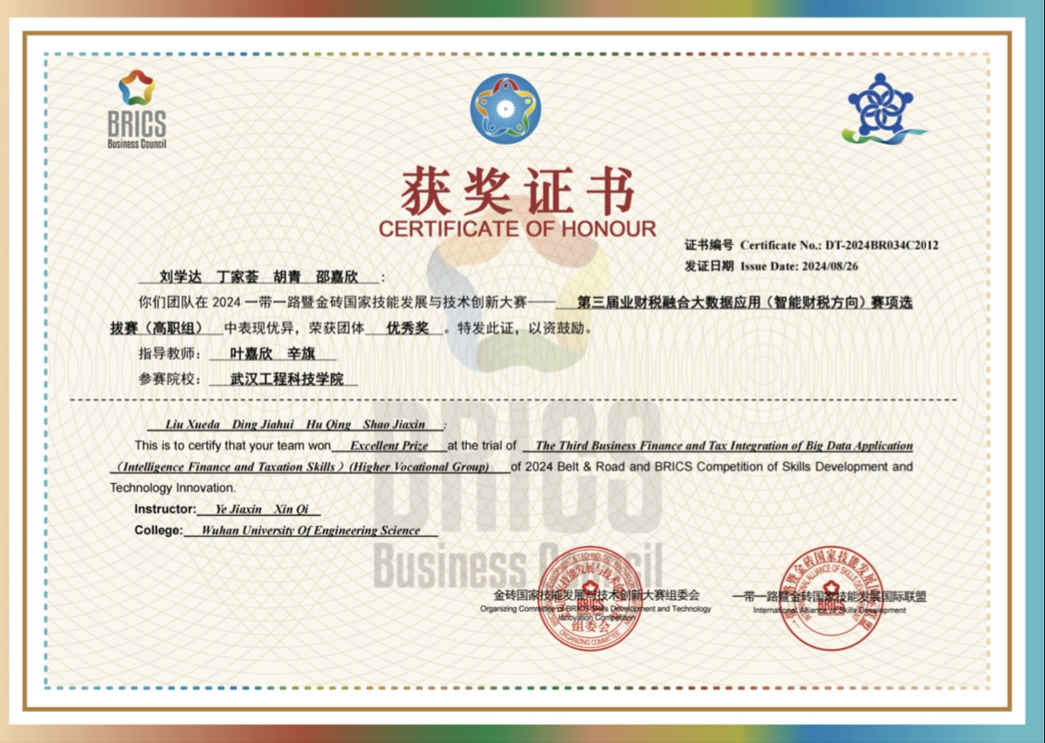 近日,2024年第八届“一带一路”暨金砖国家技能发展与技术创新大赛之业财税融合大数据应用赛项高职组选拔赛圆满落幕。本次大赛作为金砖国家间教育合作、技能开发与人文交流的重要平台,吸引了来自全国各地的高职院校积极参与,经过激烈角逐,我校代表队凭借出色的表现荣获团体三等奖和团体优秀奖,为学校赢得了荣誉。