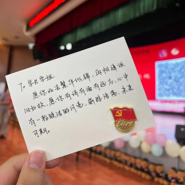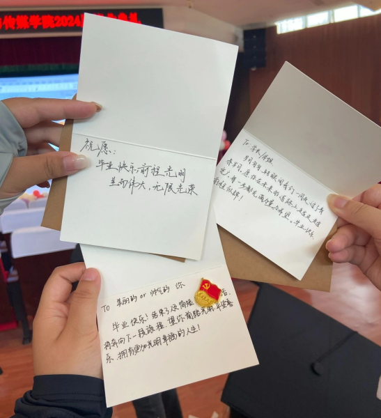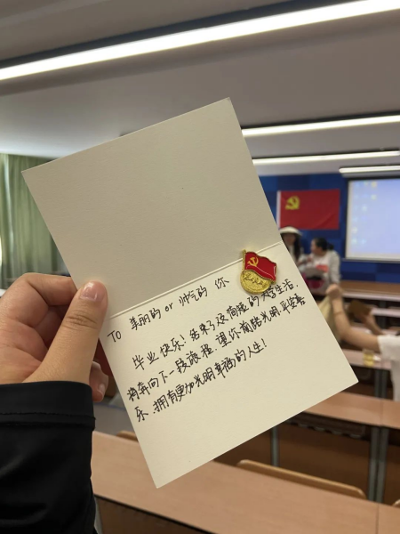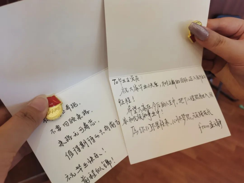 最后,学院师生党员给毕业生党员手写贺卡,送上青春祝词,踏上更远的征途。贺卡里面是对所有毕业生党员的深情寄语和殷切期望,希望他们能够带着母校的祝福,在未来的发展中越来越好。