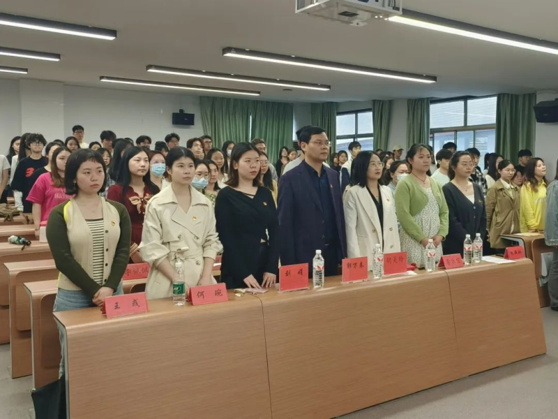 会议开始,全体师生起立奏唱国歌。