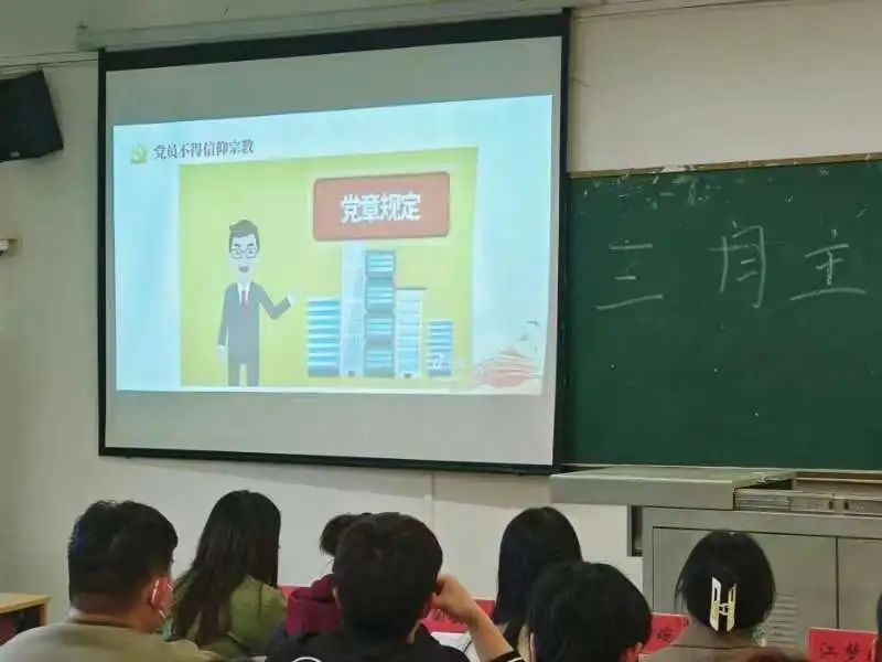 会议第七项,由学生第三党支部书记程淑玲老师带领我们通过视频学习党员不得信仰宗教。坚定共产主义理想信念,党员应坚定共产主义信仰,不信仰宗教,不参加宗教活动,自觉抵制宗教极端思想;维护党的纯洁性,党员应时刻保持清醒头脑,自觉与宗教划清界限,防止宗教势力渗透和侵蚀。遵守党的纪律,党员应严格遵守党的政治纪律和组织纪律,不得在党内宣传宗教教义、发展教徒或从事其他宗教活动。