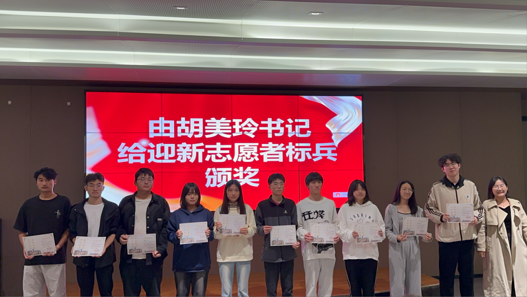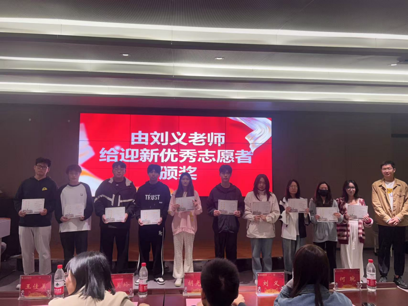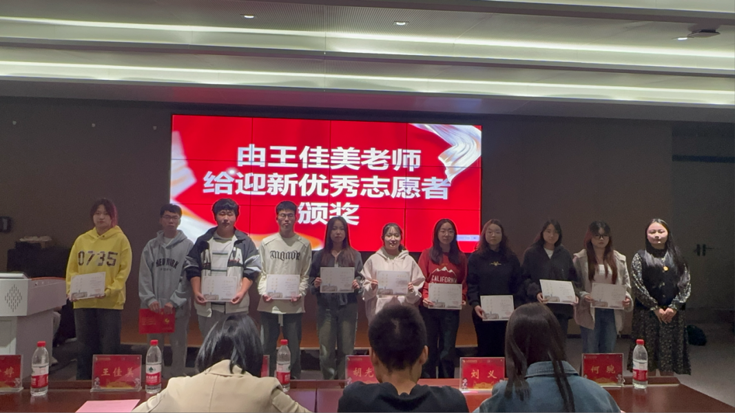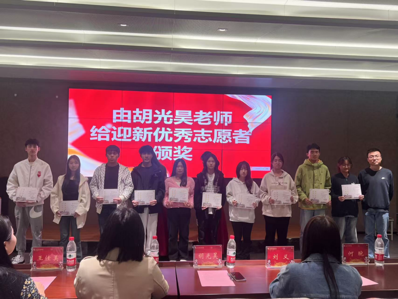 由李伊婷老师宣读迎新志愿者表彰决定,由胡美玲书记给迎新志愿者标兵颁发证书,胡光昊老师、王佳美老师、刘义老师给优秀志愿者颁发证书并合照留念。