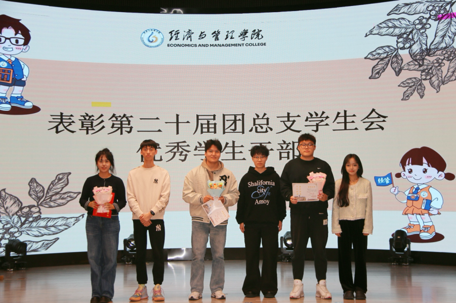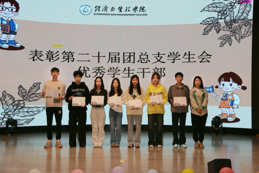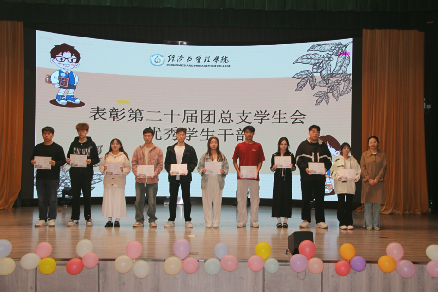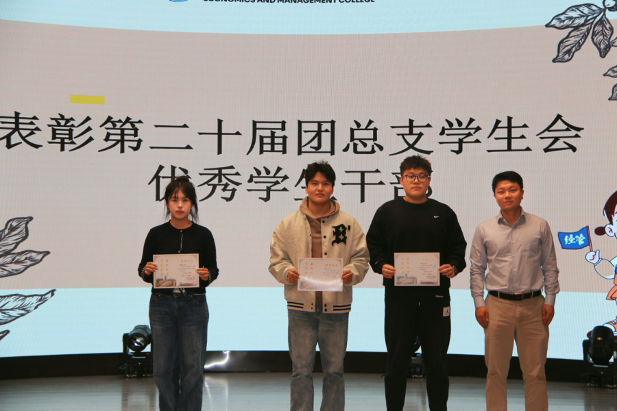 大会第二项,江梦婷老师宣读《经济与管理学院团总支学生会优秀学生干部名单》,何博文老师为第二十届优秀主席团颁发证书并合影留念,紧接着第二十一届主席团为第二十届优秀主席团献花,侯琴老师为第二十届部长级颁发证书,李伊婷老师为第二十届优秀部员颁发证书,感谢他们这一年的辛苦付出,为新一届团学成员树立了良好的榜样。
