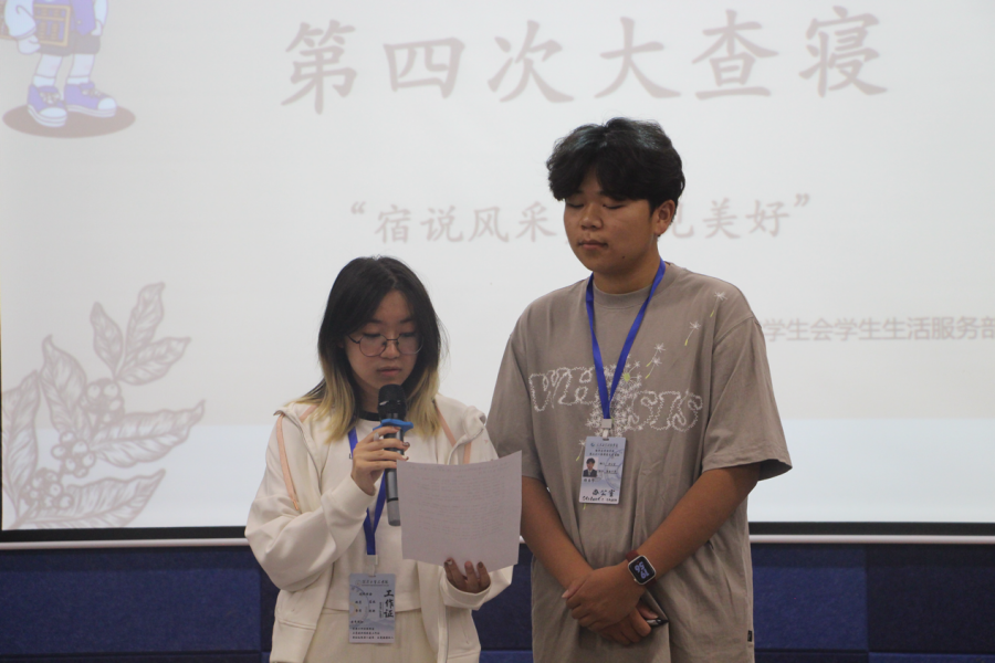 第一项,学生生活服务部部长尹文凯发表讲话,他首先表示查寝主要是为了给同学们营造一个良好的宿舍环境,同时,对上次查寝中的优秀寝室当作模范提出表扬。