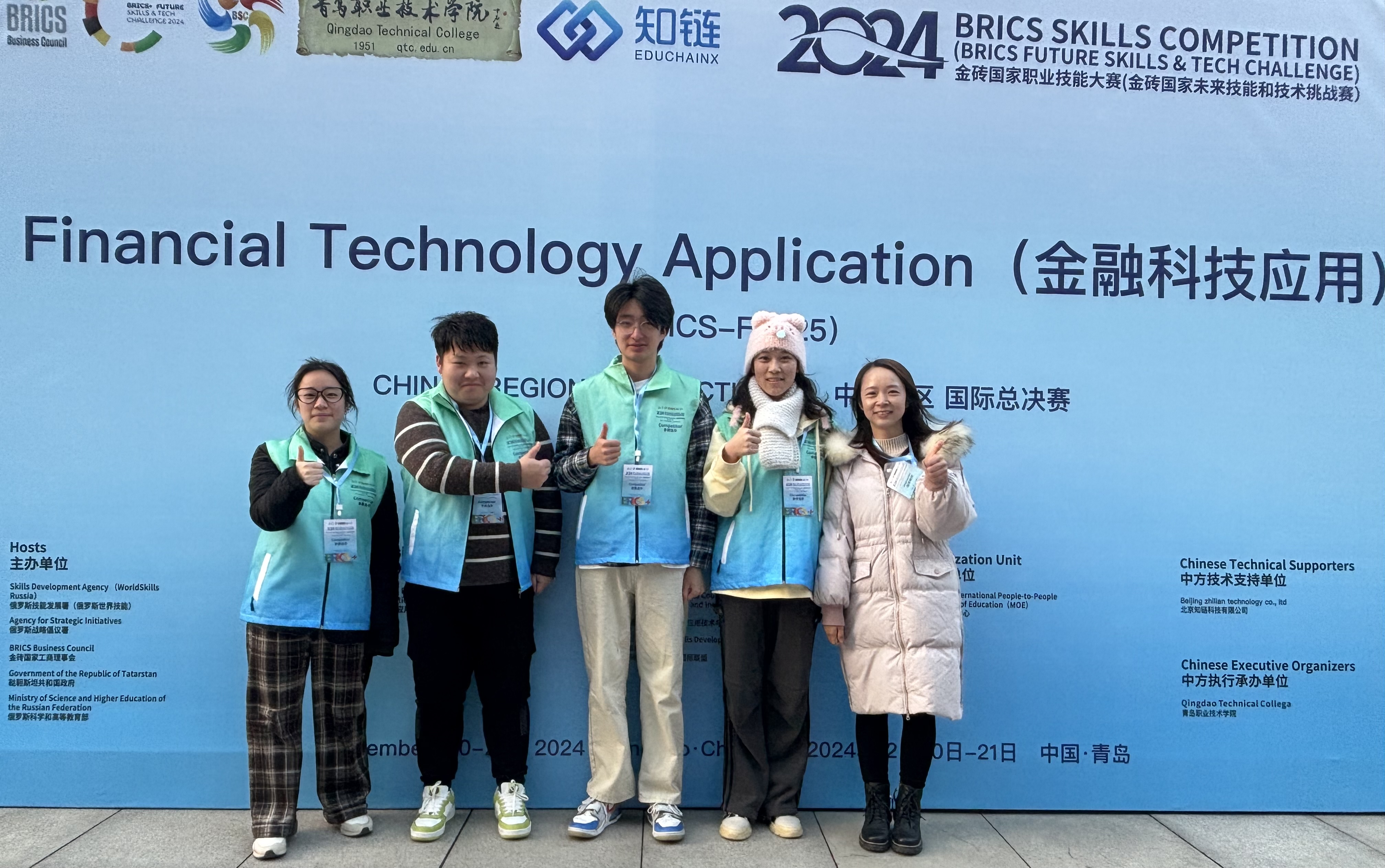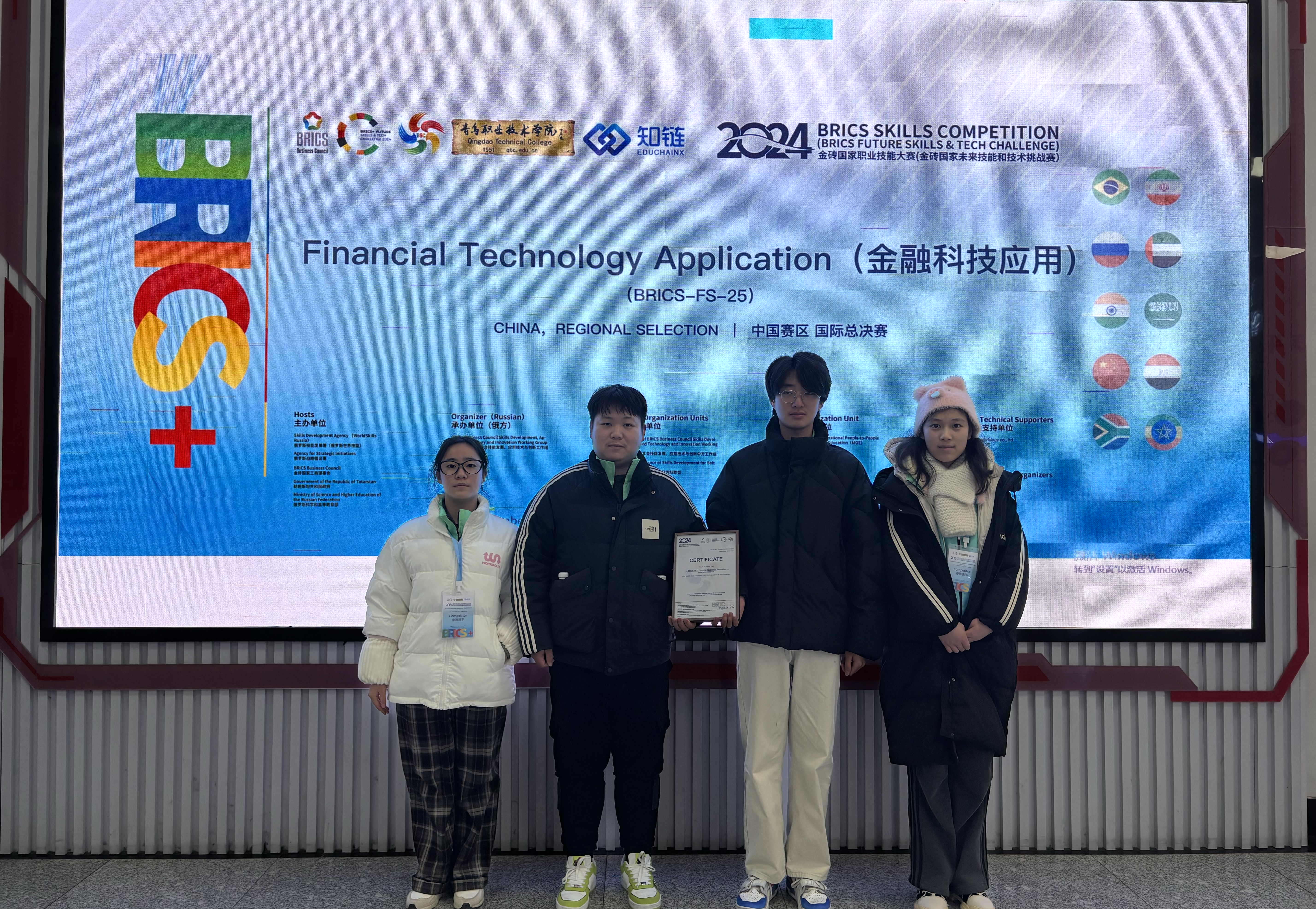 在数字经济产业学院的大力支持下,我院学生王田露、闫隽舒、魏冠哲、李文宇(指导老师:马念、邓莹)参加2024年12月20-21日在青岛职业技术学院举行的2024金砖国家职业技能大赛金融科技应用赛项国际总决赛,荣获国内三等奖。
