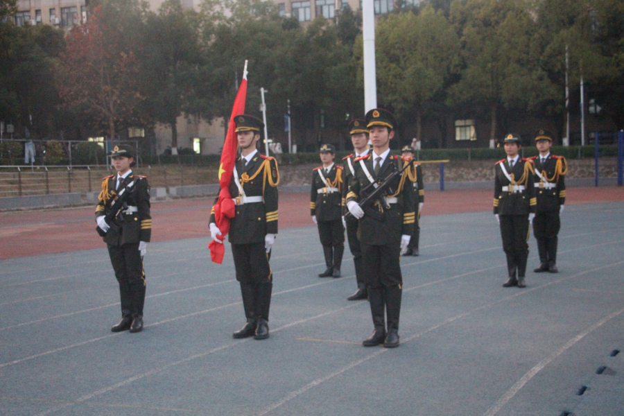 第一项,出旗。国旗护卫队的队员们早已严阵以待,他们身着整洁的礼服,身姿笔挺,气宇轩昂。随着一声清脆响亮的口令,护卫队迈着整齐划一、刚劲有力的步伐,护送着五星红旗缓缓走向升旗台。那坚定的步伐声,仿佛是青春在大地上踏出的强音,每一步都彰显着对祖国的忠诚与敬意。