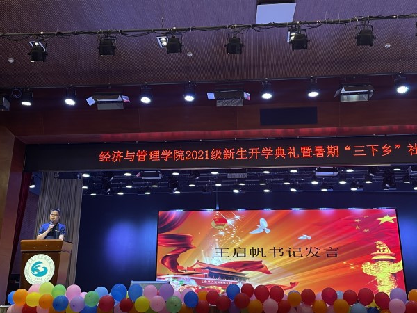为做好2021级新生入学工作,使广大新生更好的融入大学生活,2021年9月27日下午6点,经济与管理学院2021级开学典礼暨暑期“三下乡”社会实践展于三教报告厅成功举行。经济与管理学院院长胡晓峰,副院长兼党总支书记王启帆书记,学工科科长兼团总支书记徐娅妮、新生辅导员和各位优秀老师也参加此次活动。