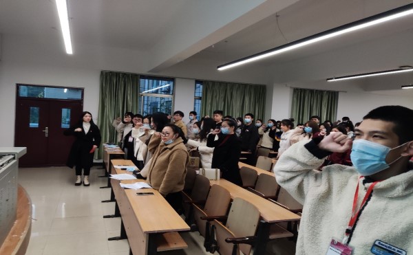 会议伊始,全体齐唱国歌,第一党支部组织委员刘兴馨老师带领全体党员同志重温入党誓词,党务助理对各支部的党费缴纳情况进行了汇报。