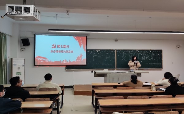 大会第七项,由第二党支部书记张冬琦老师进行了总结,她表示我们不仅要深刻了解中国共产党一百年的奋斗历程,还要认真学习和实践中国共产党人身上的奋斗精神,不忘历史、不忘复兴使命。广大党员要以身作则,践行“一训四风”的要求,做好先锋模范带头作用。