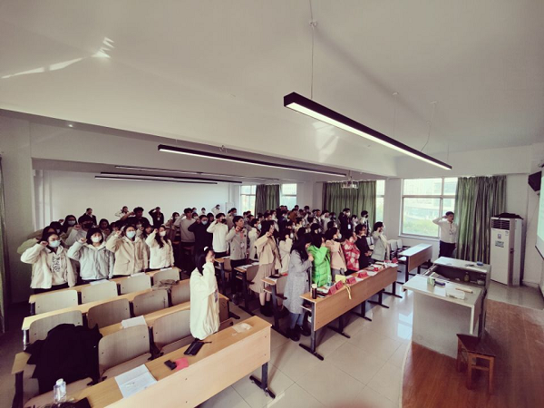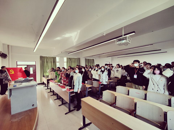 随后由党务助理为43名新发展的党员分发党徽,经济与管理学院学生第三党支部组织委员刘婷老师带领全体同学在党旗下进行了入党宣誓。43名新党员在党旗下对党和人民作出的庄严承诺,为共产主义奋斗终身、为党和人民付出一切的声音在教室中回荡。
