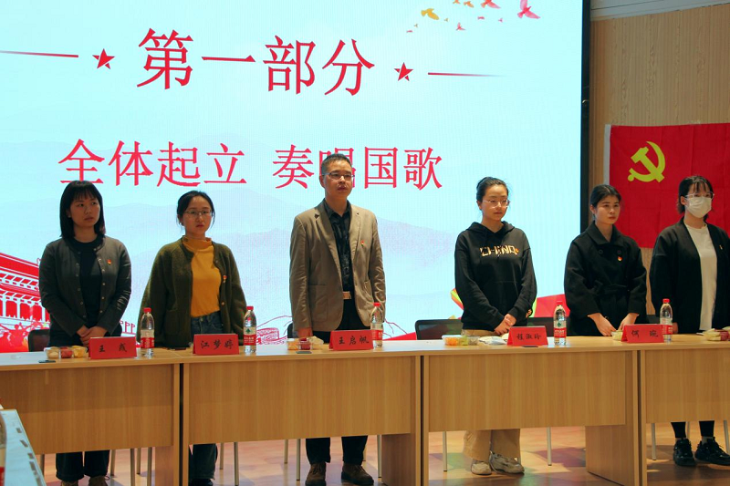 会议开始,全体起立,奏唱国歌。紧接着,王启帆书记带领大家重温入党誓词,所有人目视前方,高举右拳,宣誓声铿锵有力。