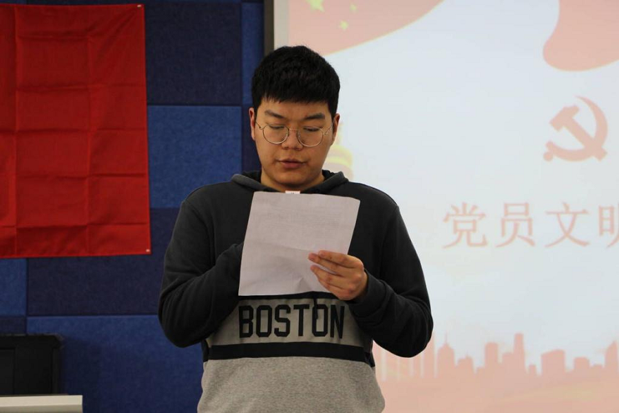 大会第四项,党员文明宿舍代表发言,由学生第二党支部潘子延同志进行发言,他认为党员寝室的领导作用十分重要,在班级和生活中,带动同学们维持寝室干净卫生,形成干净整洁的学习生活环境,并且在以后会一如既往,团结友爱,互勉互力,不断总结经验,发扬优点,改进缺点,更进一步!