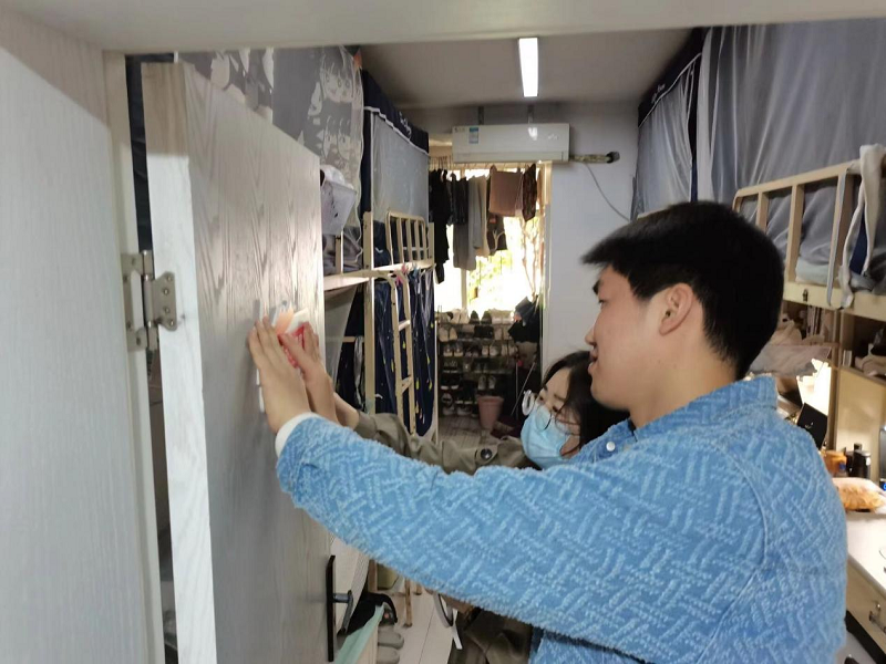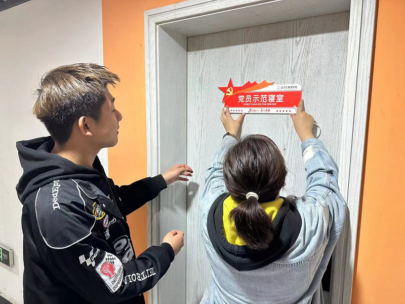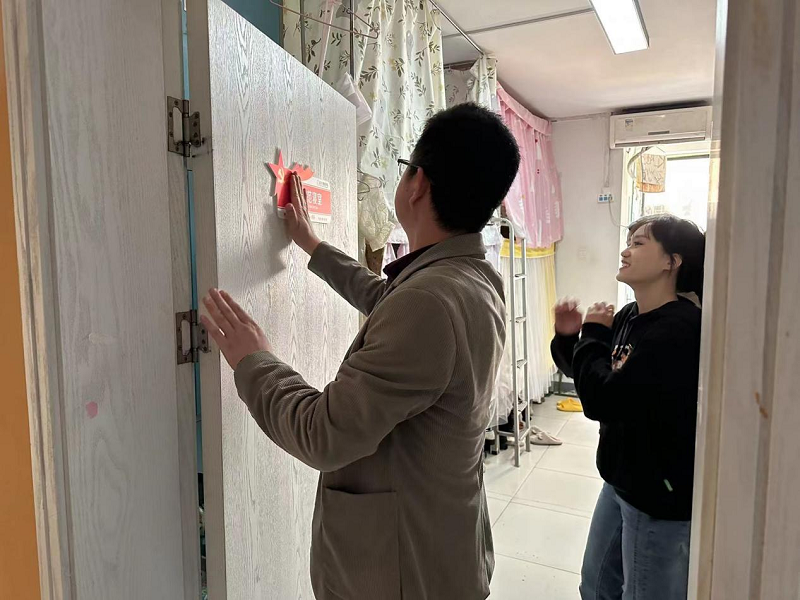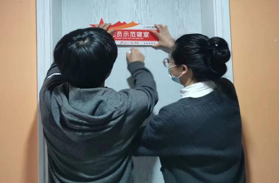 会议结束,书记及各党员同志一起前往寝室挂牌,为党员宿舍挂上了精心制作的党员宿舍标识牌。