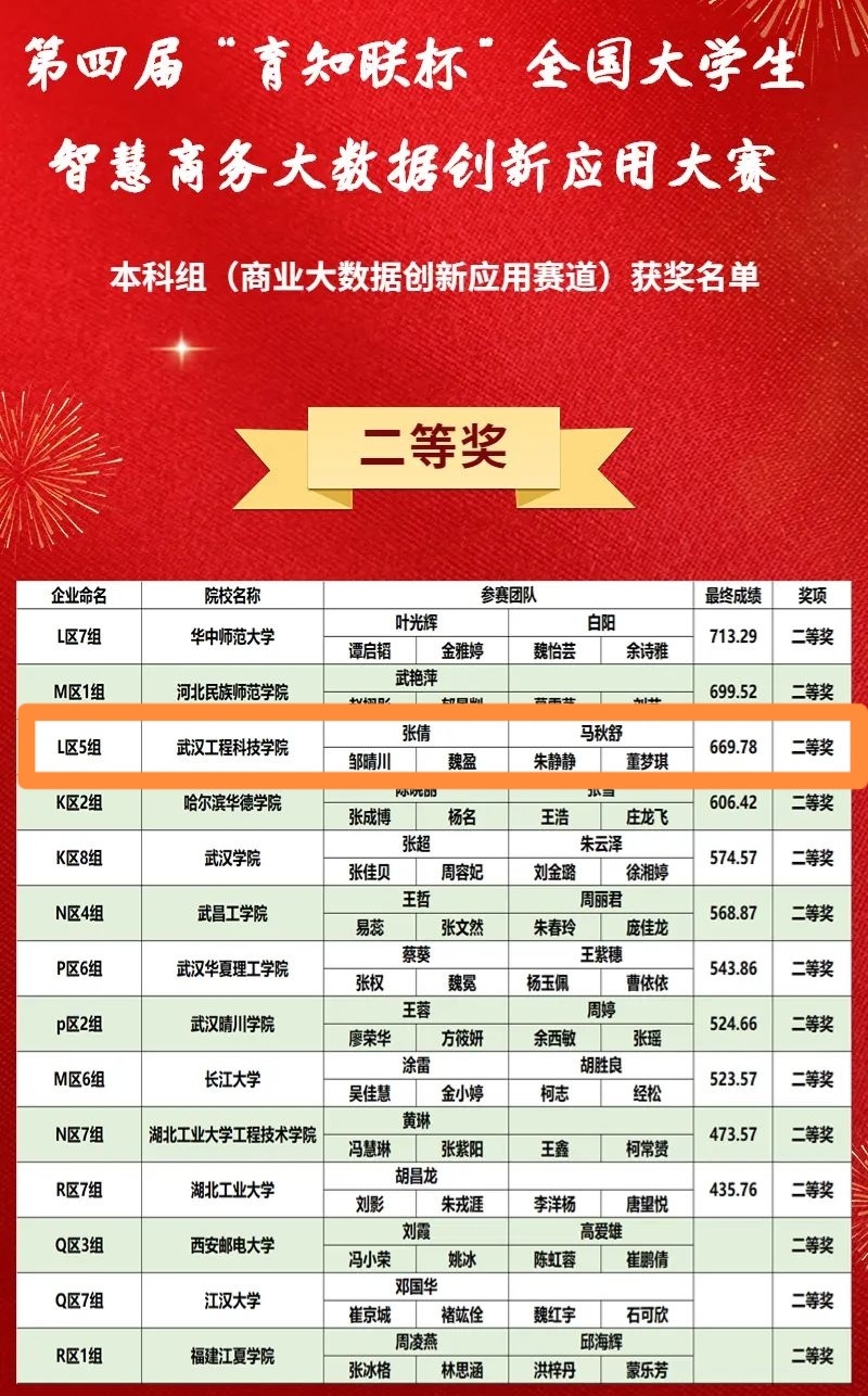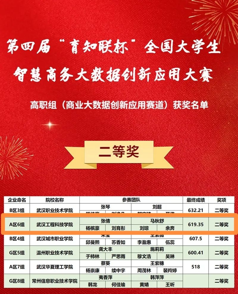 4月8日,由中国商业经济学会主办,中国MBA精英峰会协办,中南财经政法大学、常州信息职业技术学院承办,武汉育知联信息科技有限公司技术支持的第四届“育知联杯”全国大学生智慧商务大数据创新应用大赛暨亚洲商学院数智精英挑战赛于如期举行。我院张倩、马秋舒老师指导的团队获得大数据分析赛道二等奖两项,叶舜、张红、肖琳琳老师指导的团队获得商务决策赛道三等奖三项,团队最佳风采奖一项。
