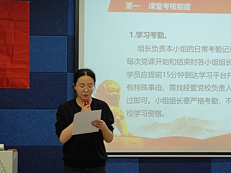 大会第三项,学生第三党支部书记程淑玲为大家介绍党校相关事宜,从学习考勤、纪律处分、学习结业及评优、党校评优制度、党校优秀小组评选制度五个方面对此次党校的学习纪律做出了要求,党校学员们在上课期间需保持良好的课堂纪律,认真学习,做好学习笔记,并真挚祝福学员们此次党校顺利结业。