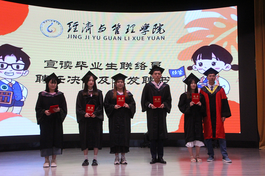 会议第二项,毛洪涛副院长宣读经济与管理学院校友联络员聘任决定。为进一步加强校友之间、校友与母校之间的联系,培养在校生校友意识,充分发挥校友的桥梁与纽带作用,根据校友联络员选聘办法的要求,经班级推荐,学院审核,决定聘任苟浩瀚等10位同学为2023届毕业生校友联络员,由涂淼副院长为他们颁发聘书并对全体毕业生寄语希望,希望大家主动支持校友联络员的工作,各校友联络员要不负学院重托,不忘职责使命,把本届校友联络好、组织好、团结好,密切保持与学院的联系,为母校的建设、发展和校友事业的进步贡献力量。