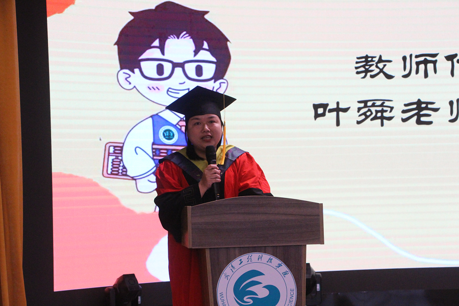 会议第三项,优秀教师代表叶舜老师上台发言,她回忆了四年来和同学们在一起共同成长的点点滴滴,希望毕业生们尽快适应新工作、新环境,把毕业看做新的起点,继续学习;也希望毕业生们能够铭记老师的教导,以青春之我、奋斗之我,砥砺奋进,再创佳绩。