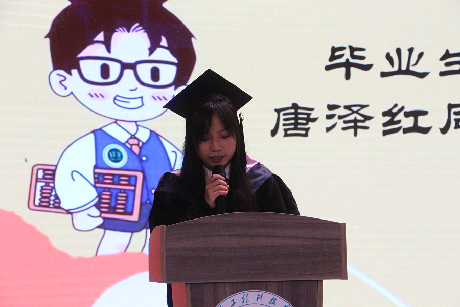 会议第四项,优秀毕业生代表唐泽红同学上台发言,她深情表达了对母校、恩师的眷恋不舍和对未来的无限憧憬,感谢老师们多年来的关怀和悉心的教导以及同学的鼓励和帮助。她表示,毕业典礼是人生中的一个重要的仪式,代表对学生时代告别,未来将担任不同的角色,肩负不同的责任。她承诺在今后的工作和生活中,一定牢记恩师们的教诲,用努力和成功来回报社会与学校。在最后她祝愿经济与管理学院桃李满天下,明天更美好。