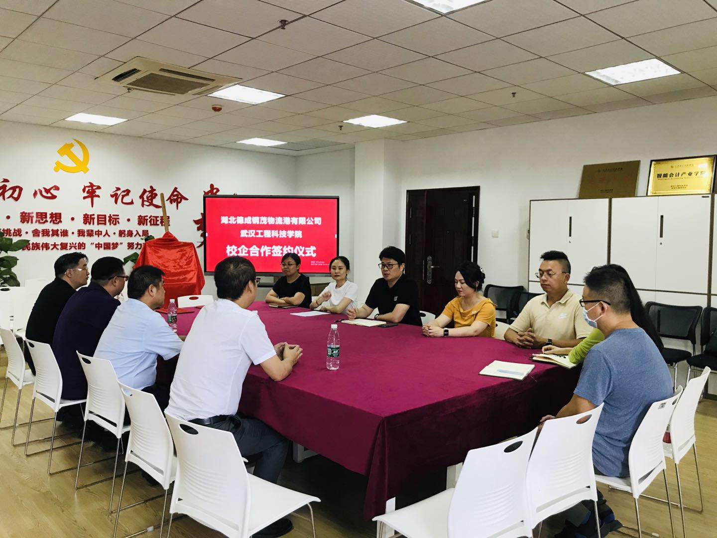 2023年7月11日中午12:30,武汉工程科技学院经济与管理学院与湖北德成钢茂物流港有限公司(以下简称德成钢茂)在综合楼807会议室举行了校企合作交流座谈会暨合作签约仪式。湖北德成钢茂物流港有限公司总经理戚合理,副总经理兰超,德成控股集团产发中心总监申峻,德成钢茂物流综管部部长张锦来校参会。经济与管理学院副院长毛洪涛主持会议,工商管理系主任文薏涵、经济系主任洪丽君、工商管理系教师李芝兰、石忠义,财务与会计系教师杨成凤参加会议。