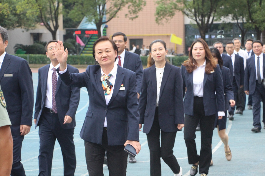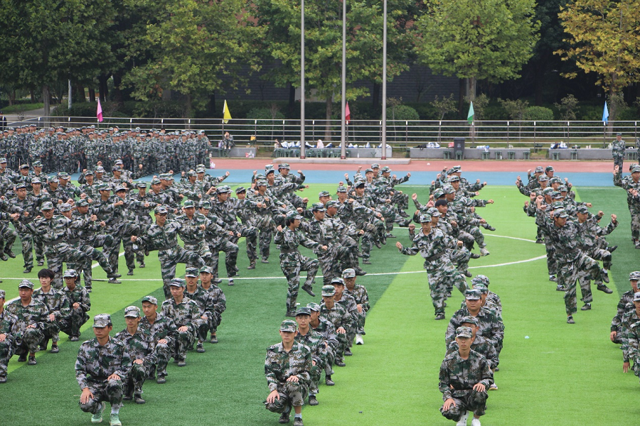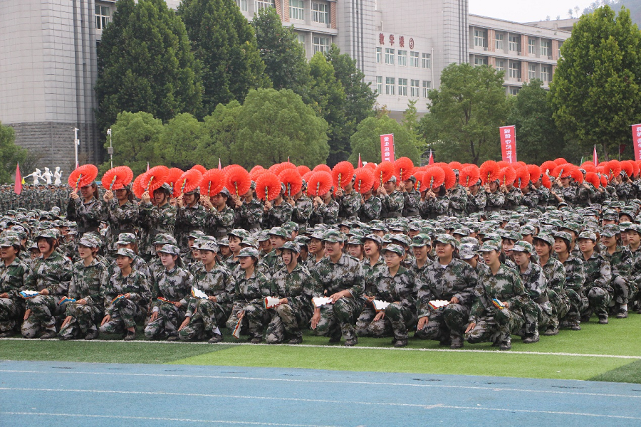 大会第二项,标兵就位,花样方阵倒计时,一个个新生举起手中的彩扇拼凑成军人敬礼的图案,随后变化为党徽图案。展现出了如今和平繁荣的盛世。这样的表演也提高学生的身体素质、团队协作意识和纪律性,增强学生的自信心和集体荣誉感。