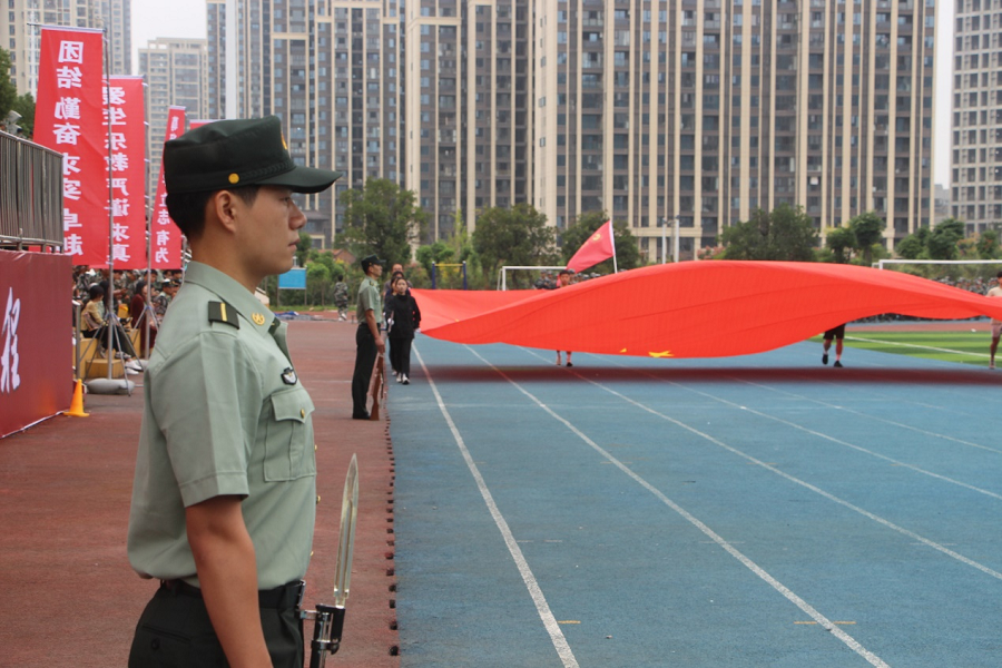 大会第一项,全体师生教官起立,升国旗奏唱国歌。