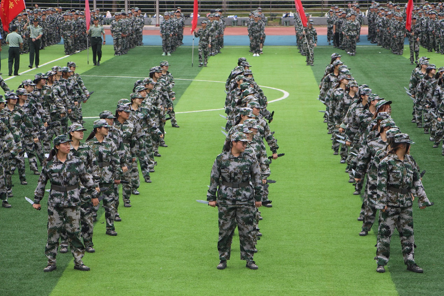 大会第五项,由经济与管理学院女生组成的匕首操方阵。在军训的大舞台上,匕首操连队是一道独特的风景线。她们以军人的标准,展现出坚忍不拔的精神风貌。看!每一个战士都像一把锋利的匕首,时刻准备着出鞘。她们身穿迷彩服,手持军用匕首,在教官的指导下,展示着各种动作。