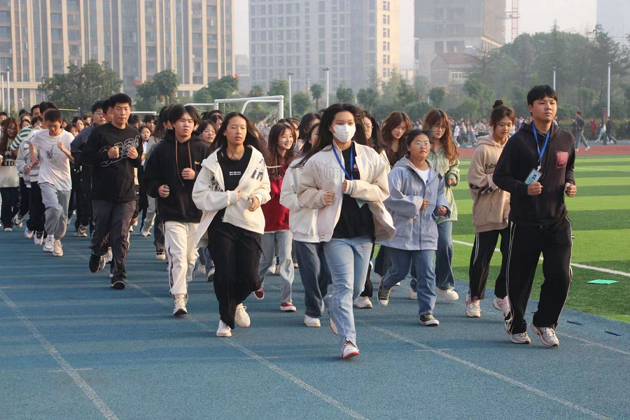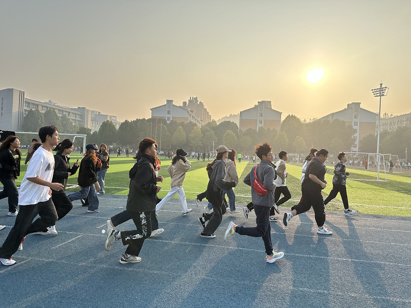学长学姐们带领队伍有序跑操,同学们积极配合,步伐整齐,队伍有条不紊,井然有序。