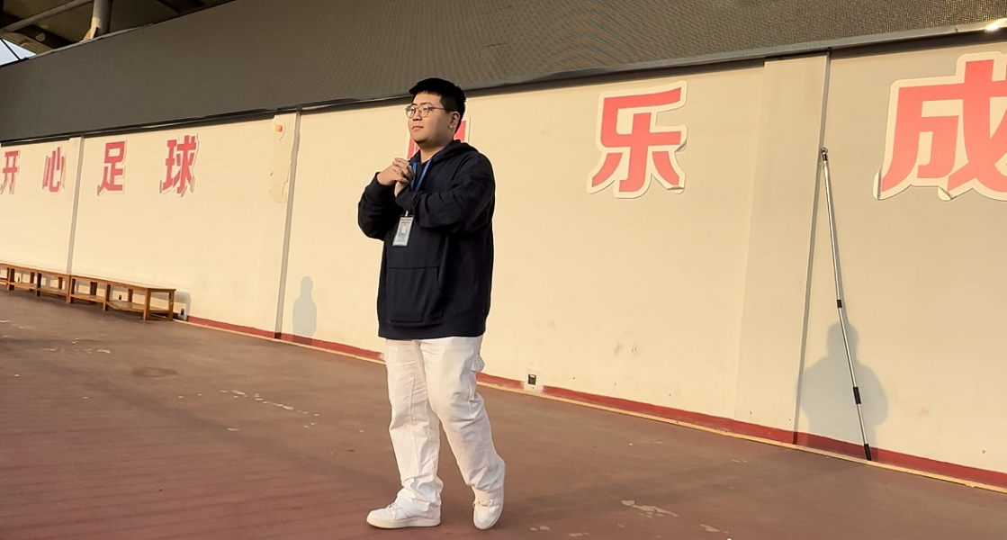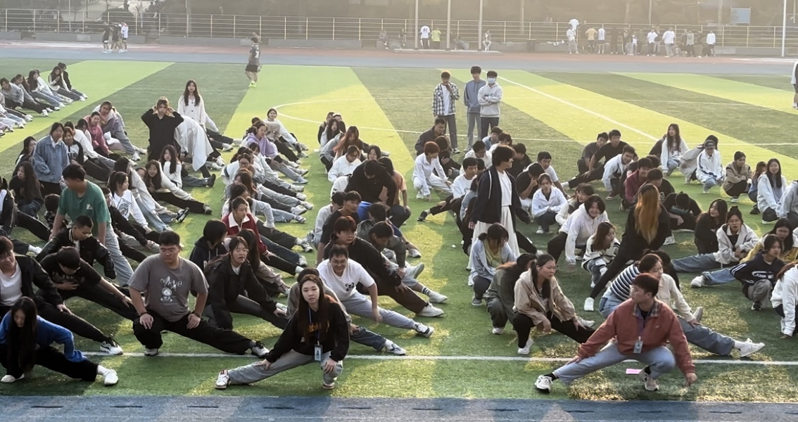 在文体部学长学姐的组织下,同学们进行了简单的热身运动。简单的热身运动能够让我们的肌肉进行一定的放松,确保我们在进行剧烈的运动时不会产生不适的反应。