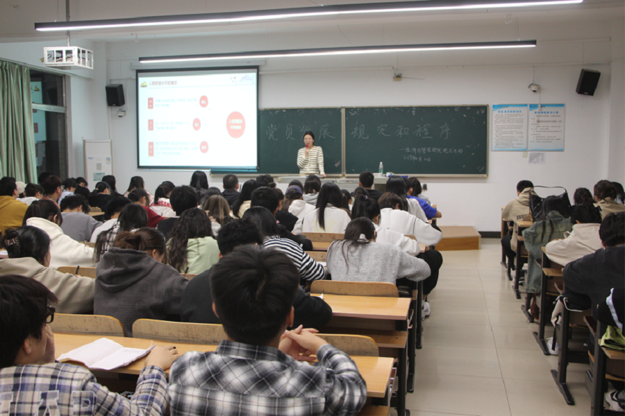 程淑玲老师分别从:入党积极分子的确定和培训,教育发展对象的确定和考察,预备党员的接收,预备党员的教育考察和转正,四个部分展开讲述,使同学们更加了解党员发展的规定和程序,从而更清楚该如何要求自己积极向党组织靠拢。