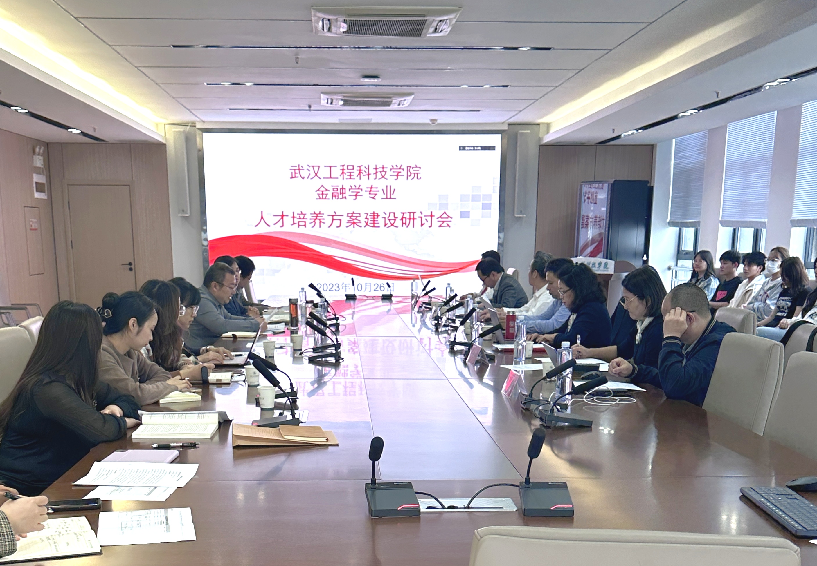 (通讯员:邓莹 刘彦君 何群)2023年10月26日上午9:00,武汉工程科技学院数字经济产业学院金融学专业人才培养方案研讨会在综合楼1210会议室顺利召开。会议由我校经济与管理学院院长胡晓峰主持,参加会议的专家有:对外经贸大学金融学院金融科技系教授潘慧峰、北京工商大学国际经管学院金融学教授葛红玲、国家开发银行行业一部高级专家向红民、五汇资产管理(北京)有限公司总经理史光、广东金融学院实验教学中心主任王小燕教授、中南财经政法大学金融学院副教授鲁臻、文华学院金融系副教授罗艳娥、北京知链科技有限公司湖北区总经理张华炳等。我院副院长涂淼、经济系主任洪丽君和经济系教师亦出席了本次会议。