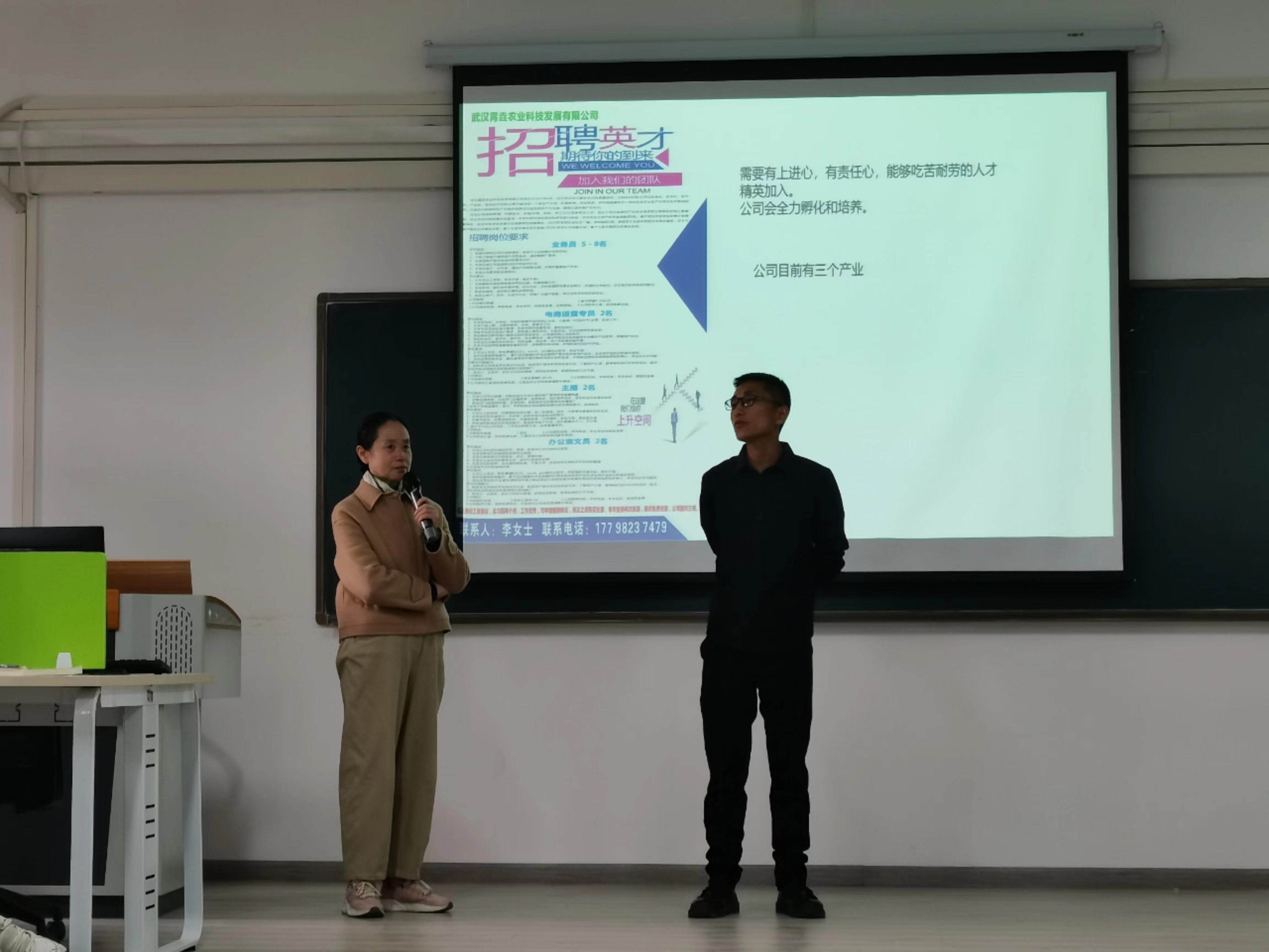 首先,企业导师曹伟向同学们介绍了公司的项目特点、孵化优势、成果展示以及未来三年的展望。乡村振兴核心在于人才振兴带动产业振兴,人才要下农村,进产业;产品要流通,进城镇。此次企业带来的招聘岗位分别是业务员、电商运营专员、主播以及办公室文员等。