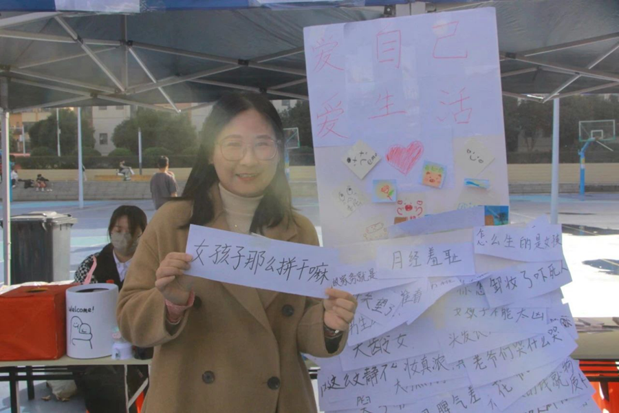 立牌上贴有多个关于刻板印象的纸条,选择一条你最讨厌的纸条,亲手撕掉扔进垃圾桶,并在另一块立牌上用便利贴写下一句鼓励别人的话语,环节完成即为挑战成功,成功者即可集笑脸贴一枚。