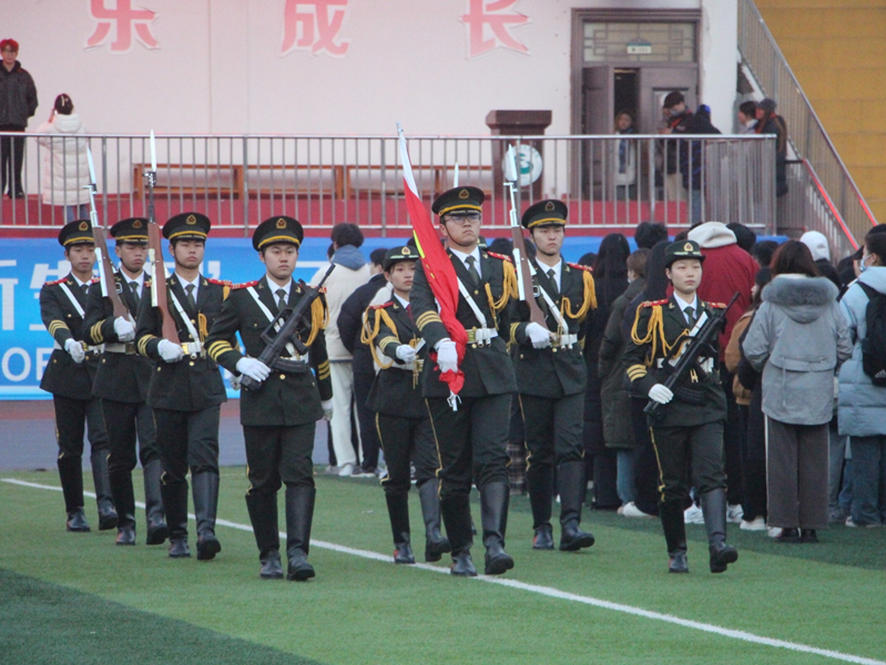 第一项,升旗仪式正式开始,护旗手们迈着整齐的步伐,昂首挺胸,目光炯炯,一步步护送国旗坚定向前。五星红旗冉冉升起,迎风飘扬,全体师生肃穆而立,瞩目国旗,展现了对祖国的无限热爱。