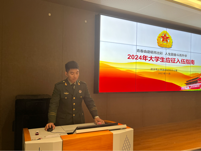 其次,韩异夫同志为我们带来的详细,全面的政策宣讲。号召广大学生、适龄青年踊跃报名参军,特别对应征入伍有哪些程序,需要注意的事项,征兵工作时间是怎么安排、征兵对象主要是哪些人、年龄如何规定、学历要求等主要内容作了详细的讲解。从而更好地帮助大学生更直观、更全面地了解征兵各项政策内容,更好的激发了大家征兵的积极性。
