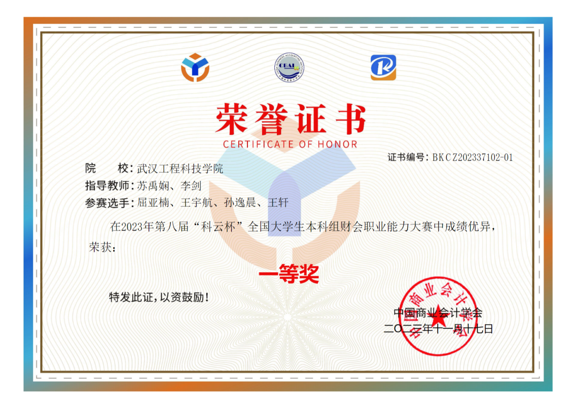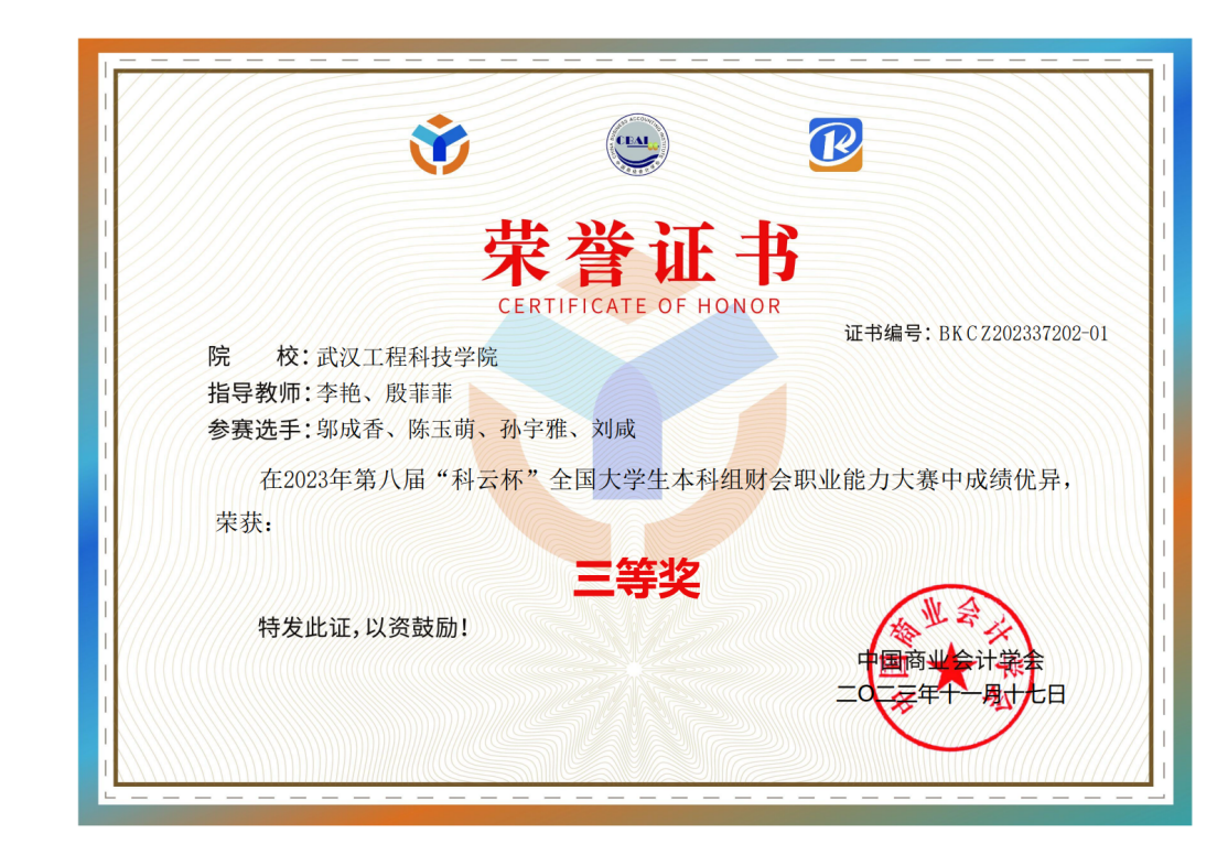 近日,2023年第八届“科云杯”全国大学生财会职业能力大赛圆满落幕。本次大赛由中国商业会计学会主办,厦门科云信息科技有限公司承办。来自全国31个省、自治区、直辖市的近500所学校参与了本次大赛。我校经过选拔,经济与管理学院派出的两支参赛队分别荣获全国一等奖(队员:屈亚楠、王宇航、孙逸晨、王轩,指导老师:苏禹娴、李剑)、三等奖(队员:邬成香、陈玉萌、孙宇雅、刘咸,指导老师:李艳、殷菲菲)。