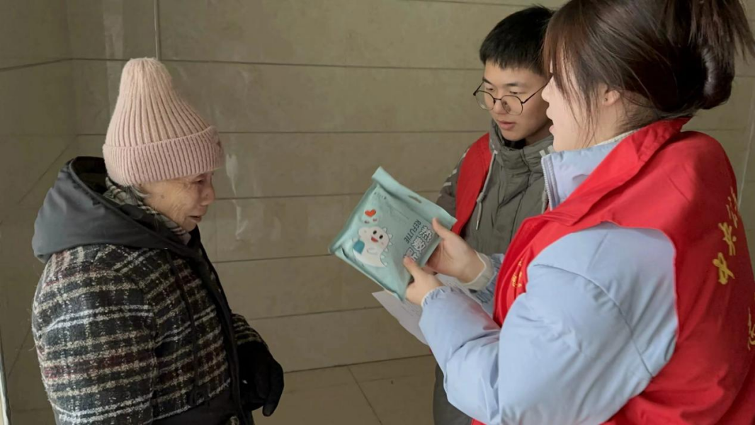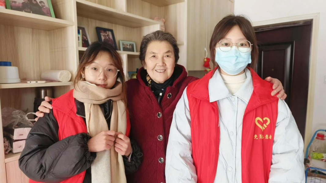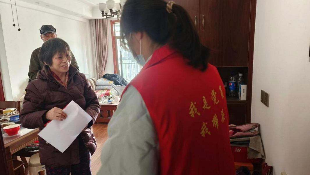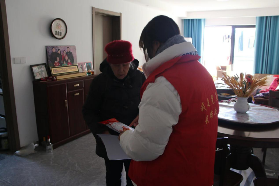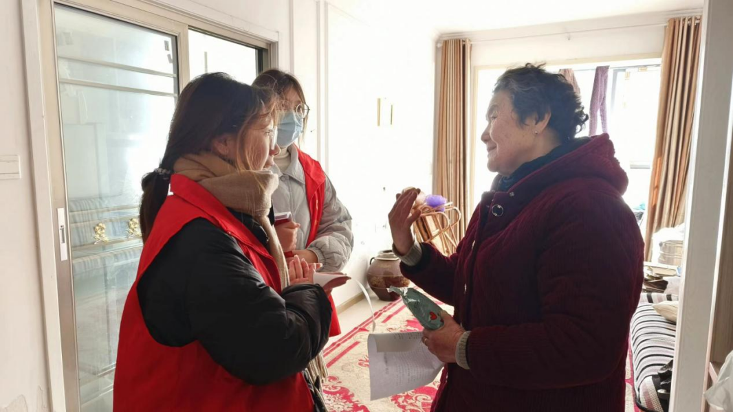 志愿者们问候老人并带了暖身贴送给老人,随后陪老人聊天并提醒老人冬天注意防寒,注意煤气使用等。