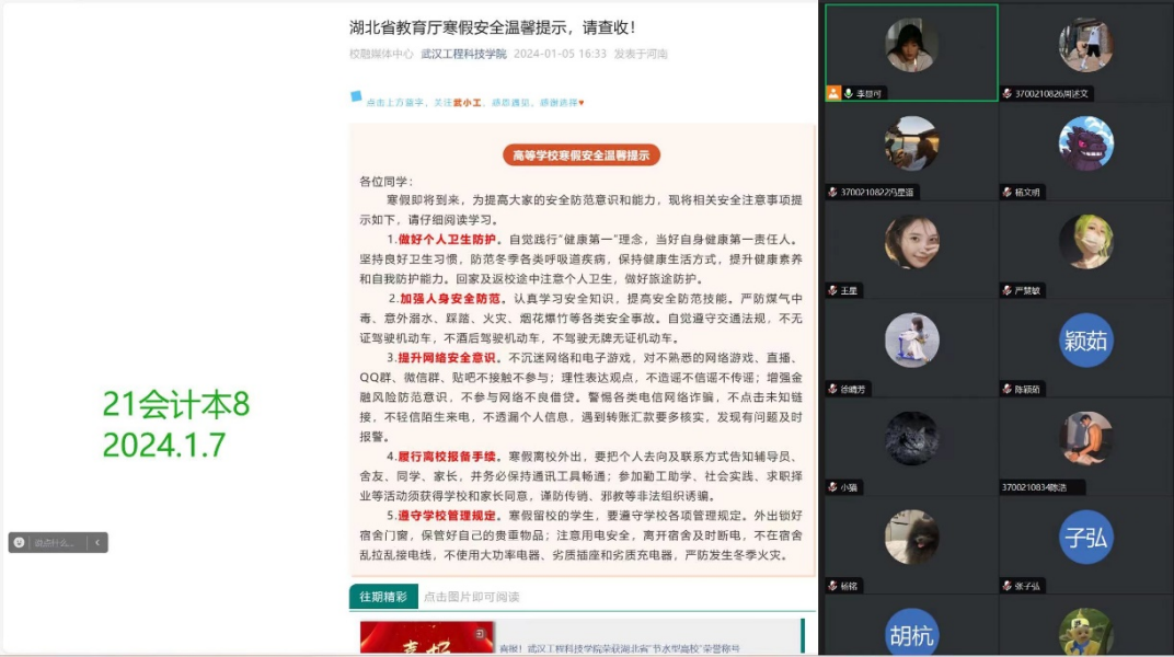 最后,再三强调湖北省教育厅寒假安全温馨提示并祝愿同学们度过一个愉快的假期。一、出行安全:1遵守交通规则,不闯红灯,不在马路上奔跑嬉戏。2乘坐正规营运车辆,注意系好安全带。注意行人安全,遵守交通规则,不横穿马路,不翻越栏杆。二、居家安全:1、不乱动家用电器,不私拉乱接电源线。2、不乱丢烟蒂,不私拉乱接电线,不乱扔垃圾。3、注意饮食卫生,不吃过期、变质、不卫生食品。4、不玩火,不燃放烟花爆竹,掌握基本消防安全知识。三、网络安全:1、合理安排时间,不沉迷于游戏、聊天等虚拟世界。2、不轻信陌生人信息,不泄露个人信息。3、注意保护个人隐私,不随意透露家庭住址、电话号码等个人信息。4、遇到网络诈骗要提高警惕,及时向有关部门举报。四、心理健康:1、多与家人、朋友沟通交流,保持良好的心态。2、注意情绪调节,不过度焦虑、抑郁等负面情绪。