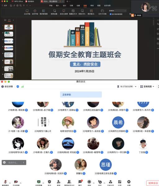 本网讯(通讯员:陶歆雅)为进一步加强寒假期间的安全教育,切实提高学生的消防安全意识,增强学生的防火自救能力,1月24日,经济与管理学院借助线上平台,组织各班进行了寒假安全教育班会。